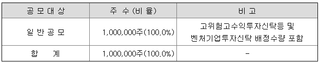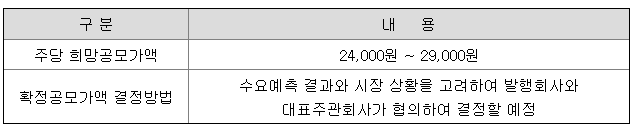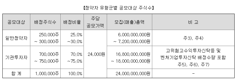 - 청약자 유형군별 공모대상 주식수: 일반청약자 250,000주 ~ 300,000주 (25.0% ~ 30.0%)
